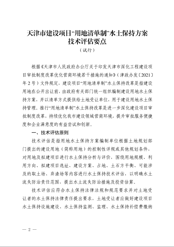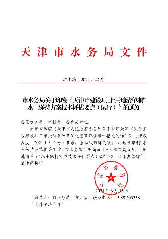 市水务局关于印发《天津市建设项目“用地清单制”水土保持方案技术评估要点(试行)》的通知