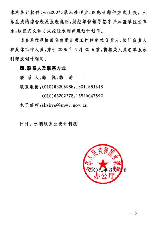(八)本报表制度于2008年年报开始执行。各单位必须于次年4月30日前将程序录入处理的数据以电子邮件方式上报,正式年报表须经领导签字并加盖单位公章后上报水利部。具体报送时间与方式要求以当年下发有关水利统计工作文件为准。